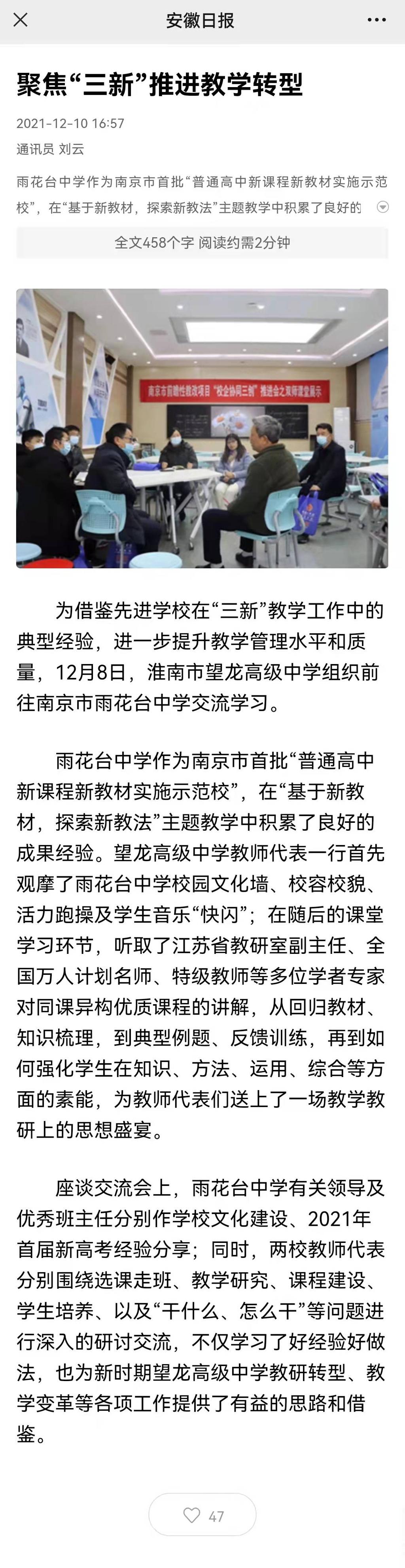 安徽日報刊登淮南市望龍高級中學 新聞——《聚焦“三新”推進教學轉型》
