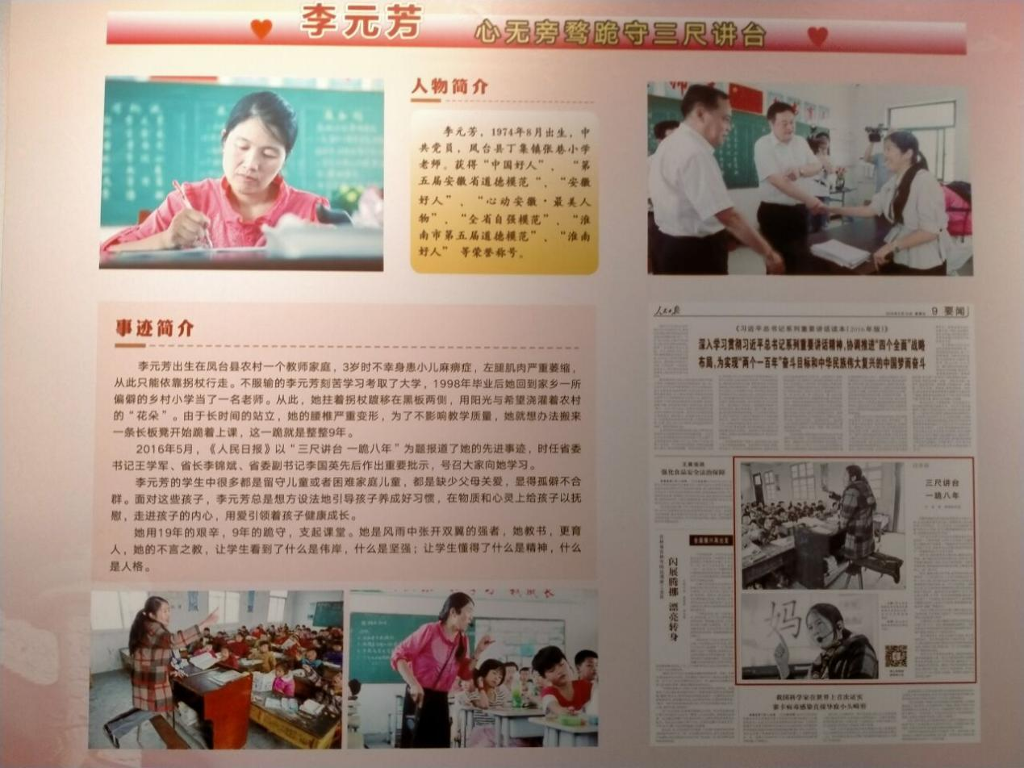 在李元芳老師的塑像前,看著展板上的事跡介紹,聽著講解員深情的講解,很多同志不知不覺地流下了感動的淚水。她,扎根鄉(xiāng)村學(xué)校二十年,默默耕耘,無私奉獻;她,三尺講臺一跪八載,教書育人,身殘志堅。跪下的是身體,挺立的是精神。她以“跪”的姿態(tài)完美詮釋了新時代教師高大的形象和高尚的情操。好人精神,令人感動,催人奮進!