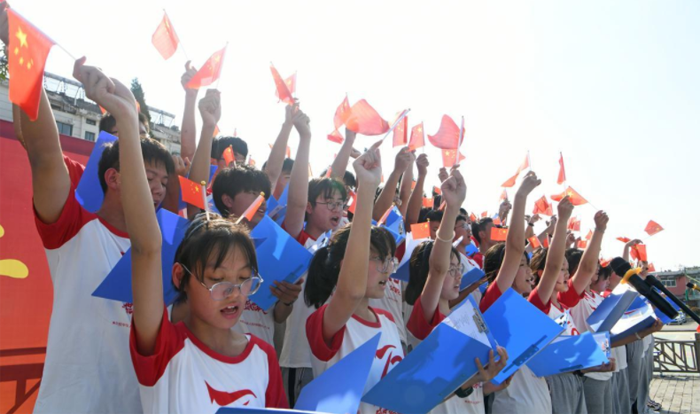淮南望龍高級中學學生為參加“喜迎二十大 奮進新征程”主題詩文朗誦會的同學鼓掌加油。