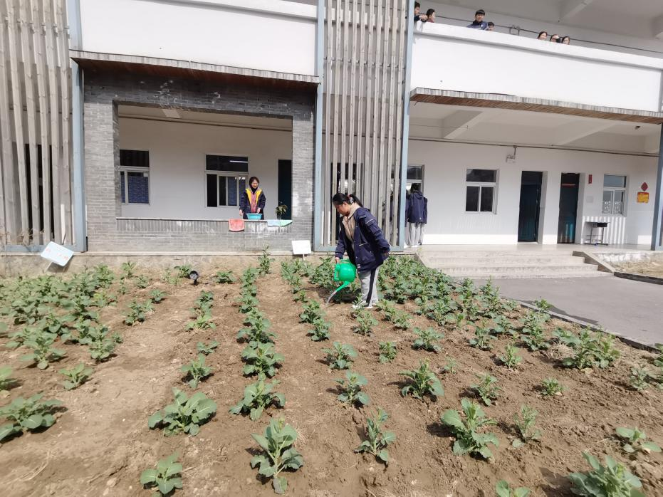 勞動教育采用“包產(chǎn)到班”的方式,每班負(fù)責(zé)一塊園地,學(xué)生們利用勞動教育課種植、除草和澆水?,F(xiàn)在油菜長勢喜人,花開滿園,成為學(xué)校一道靚麗的風(fēng)景線,蒜苗、香菜、蠶豆、豌豆也破土而出競相亮相。